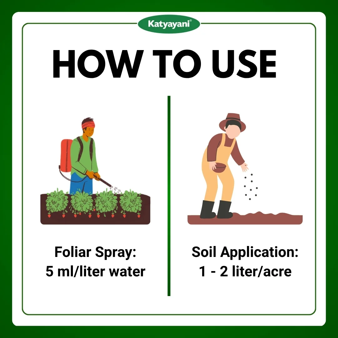 Dosage : Foliar Spray for 5 ml / liter water.Soil Application for root grubs: 750 ml – 1 liter/acre by drenching or can be mixed with 250 kg of