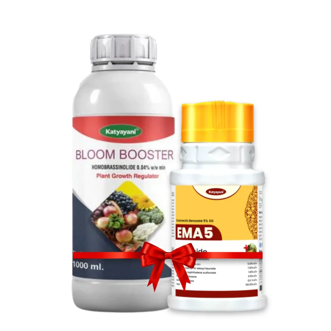 This All-in-One Kit is specially designed for legume crops like green gram, red gram, chickpea, and other pulses. It combines the power of Katyayani EMA 5 (Emamectin Benzoate 5% SG) and Bloom Booster to deliver effective pest control and boosted flowering, ensuring better crop health, yield, and flower quality.