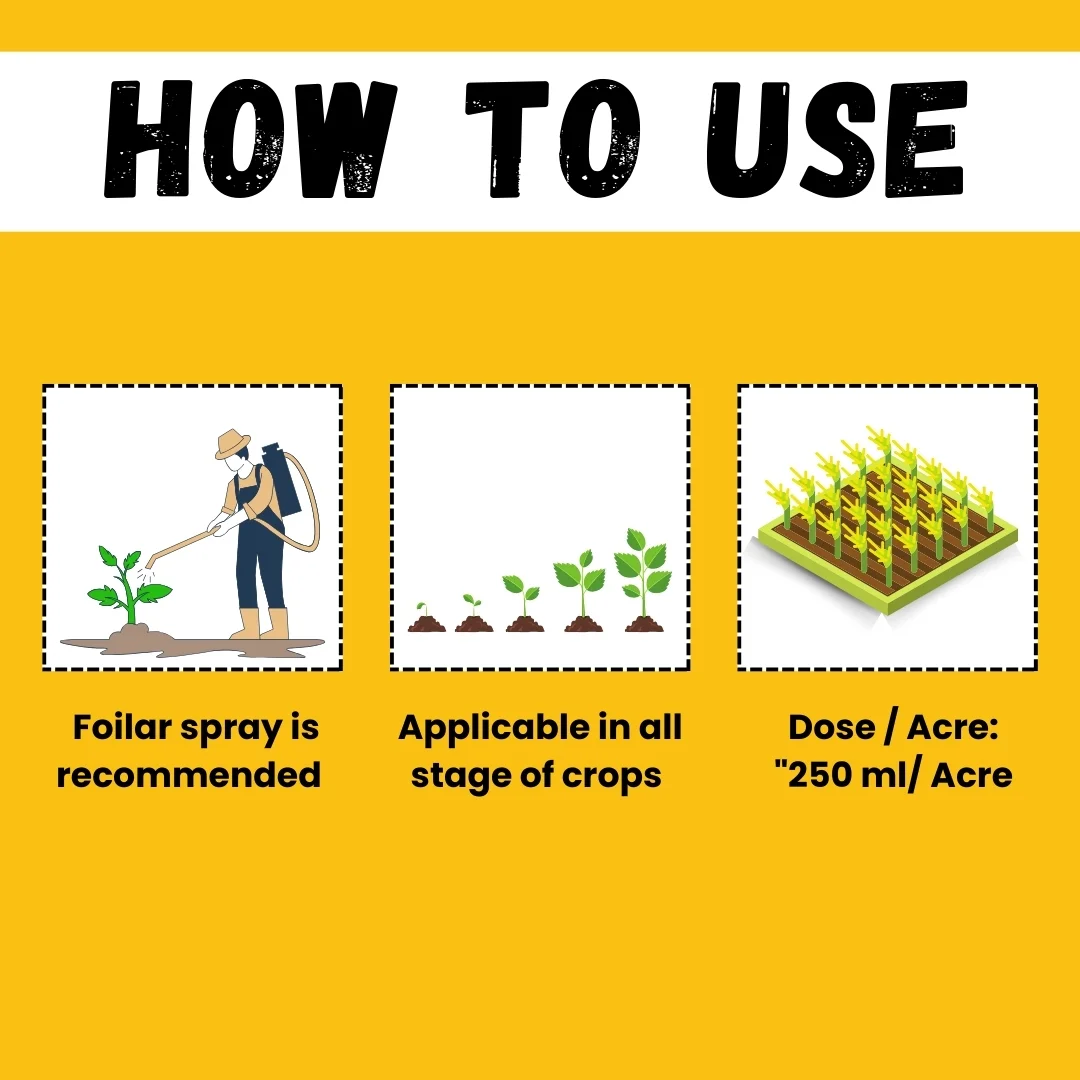 - Dosage : For Gardening Apply 2 m per 1 Litre water and Spray. For Large Applications : 200-250 ml per acre is recommended.100 ml per acre for foliar spray in all crops.Spray in combination with every foliar fertilizers and pesticides.