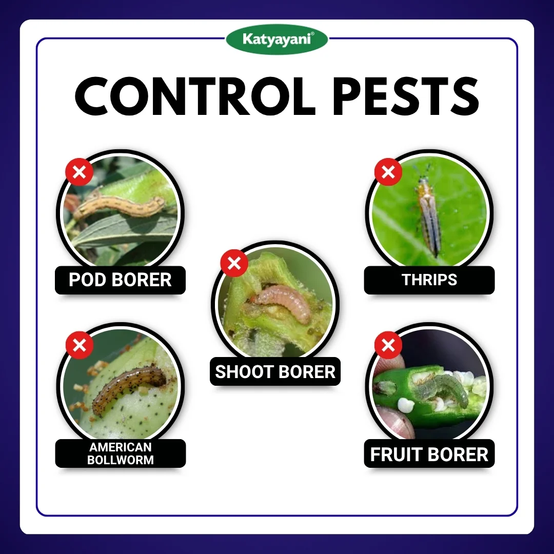 It give powerful Control of Aphids Jassids Shoot & Fruit Borer Girdle Beetle Semilooper American Bollworm Diamond Back Moth Pod