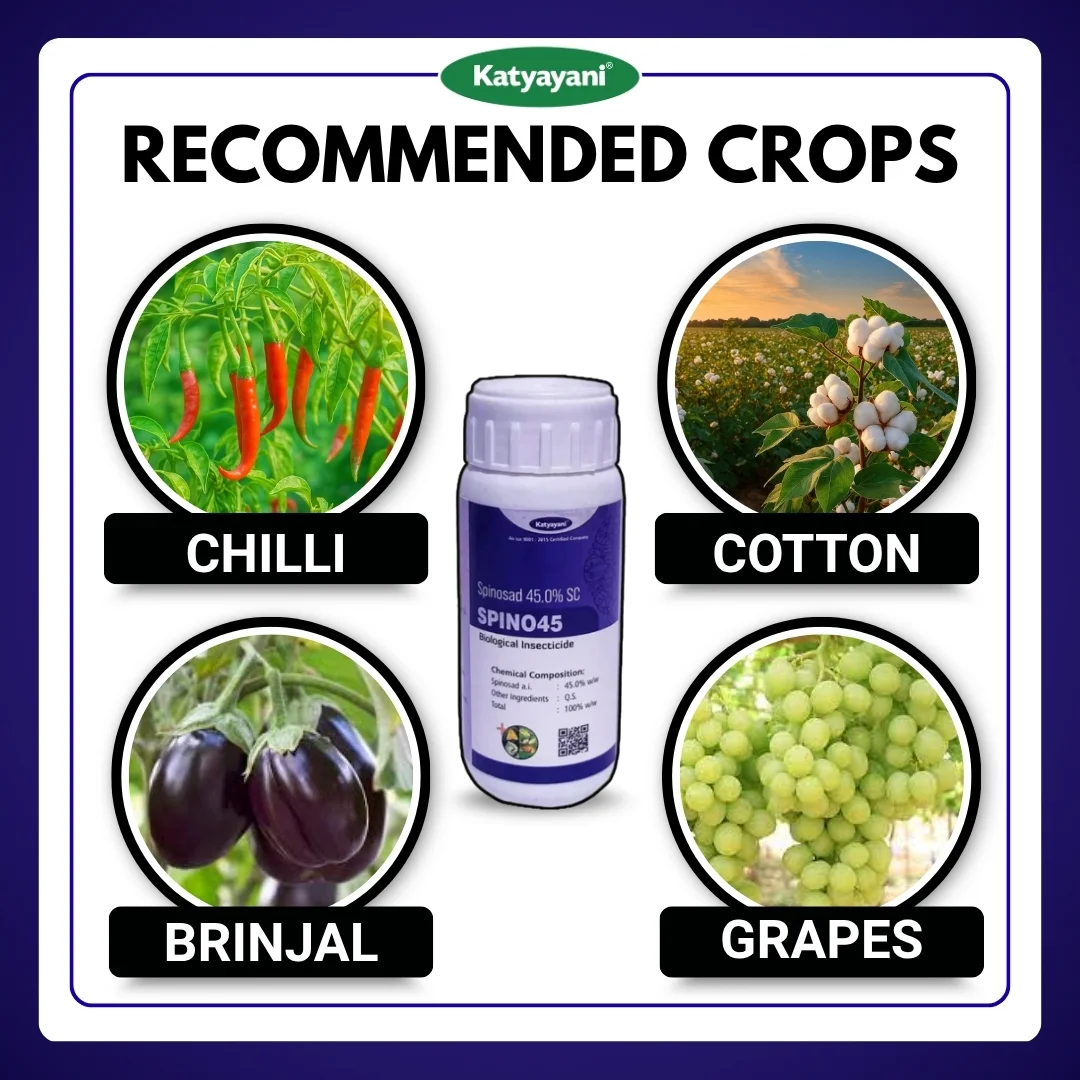 Katyayani Spino45 contains Spinosad 45% SC. Spectrum: Gram, Pigeon-pea : Caterpillar/ Pod borer; Cotton: Spotted bollworm,